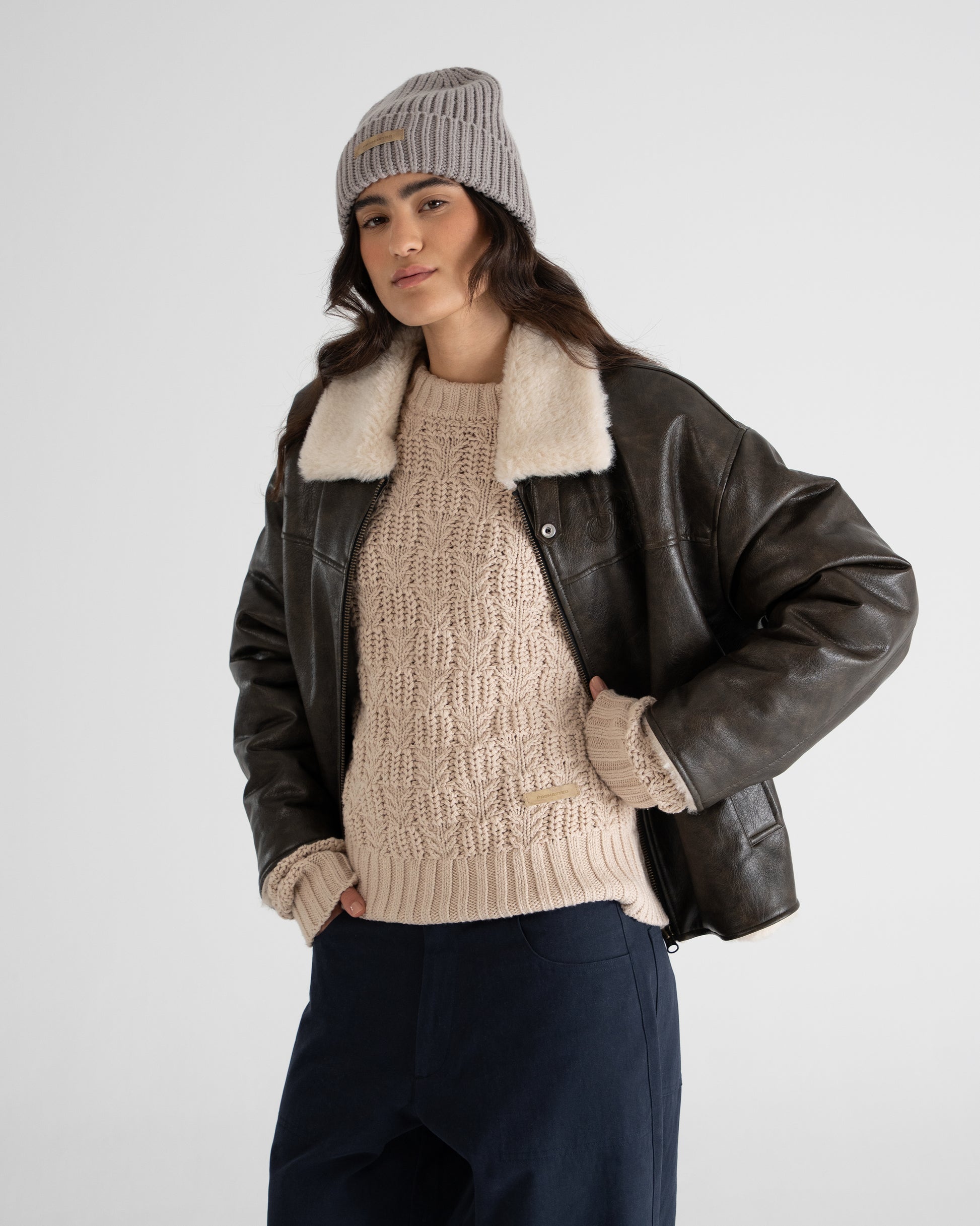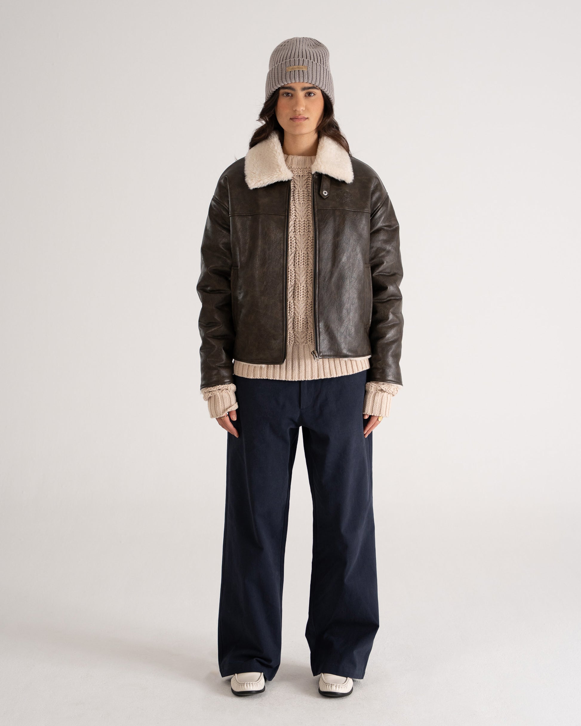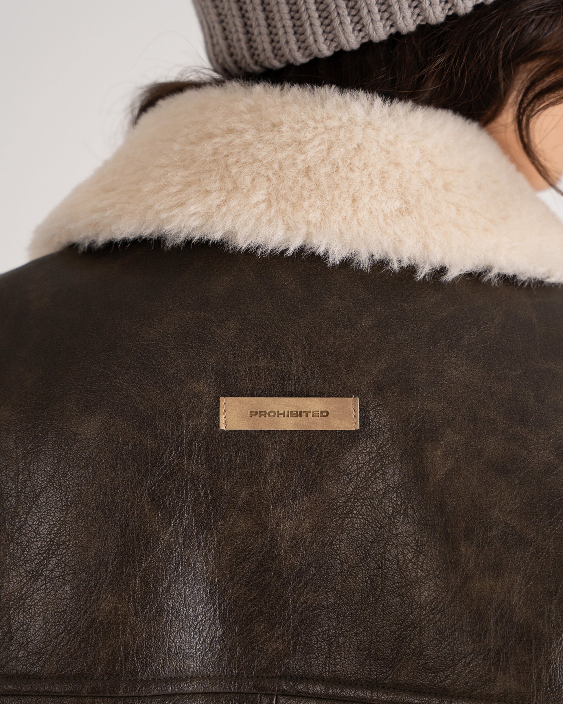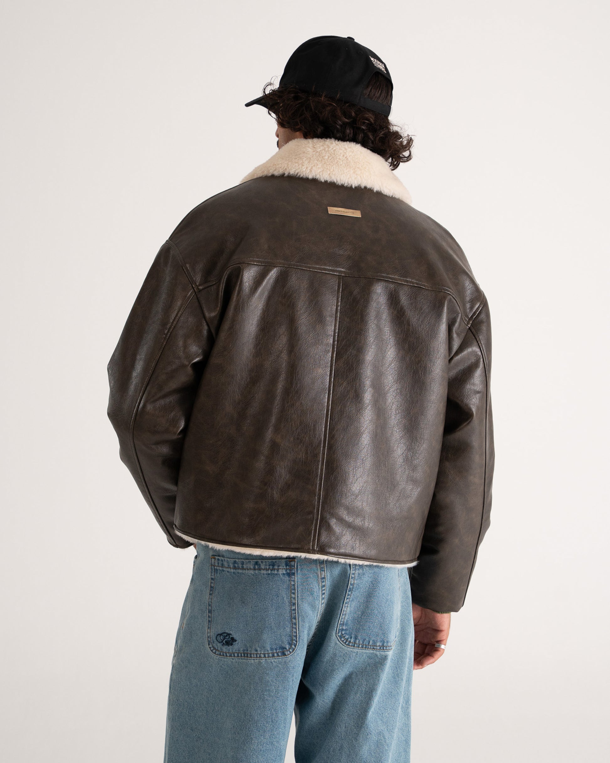 Die Maverick Jacket von Prohibited ist ein moderner Klassiker mit Retro-Anklängen. Gefertigt aus butterweichem, veganem PU-Leder (100 % Polyurethan), bringt sie die Ästhetik einer klassischen Fliegerjacke in die Gegenwart. Der markante Teddy-Fleece-Kragen sorgt für ein cozy Statement und hält angenehm warm, während der Oversized Fit eine entspannte, urbane Silhouette kreiert. Seitliche Eingrifftaschen und eine durchgehende Reißverschlussfront vervollständigen das Design – eine Jacke, die gleichzeitig cool und komfortabel ist.