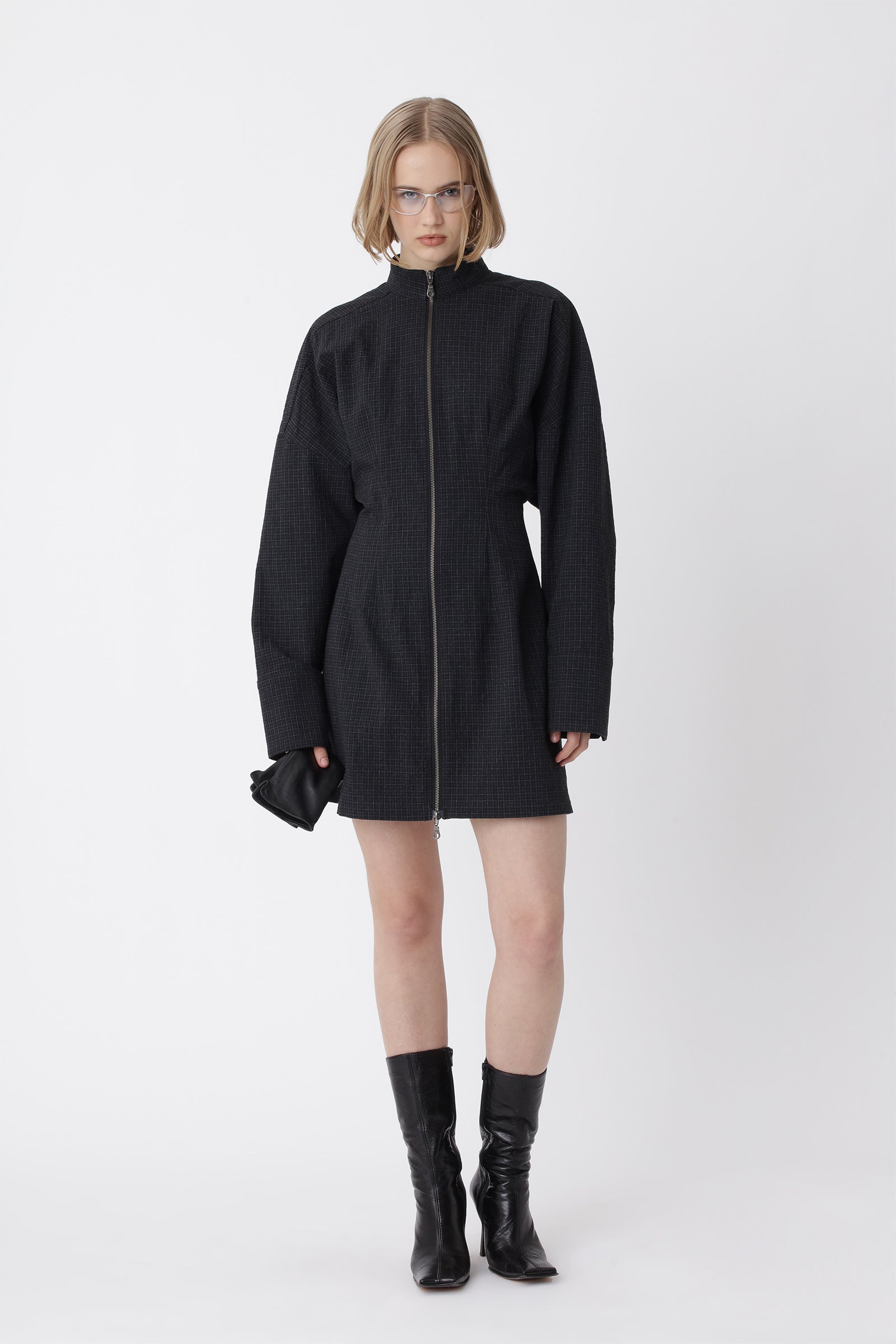 Das Micaela Shirt Dress von Won Hundred ist ein Mini-Kleid aus strukturiertem Nylonstoff, das eine moderne, texturierte Optik bietet. Überschnittene Schultern und voluminöse Ärmel schaffen eine entspannte, aber definierte Silhouette. Die Taille wird mit Falten betont, während ein Reißverschluss vorne einfachen Tragekomfort ermöglicht.