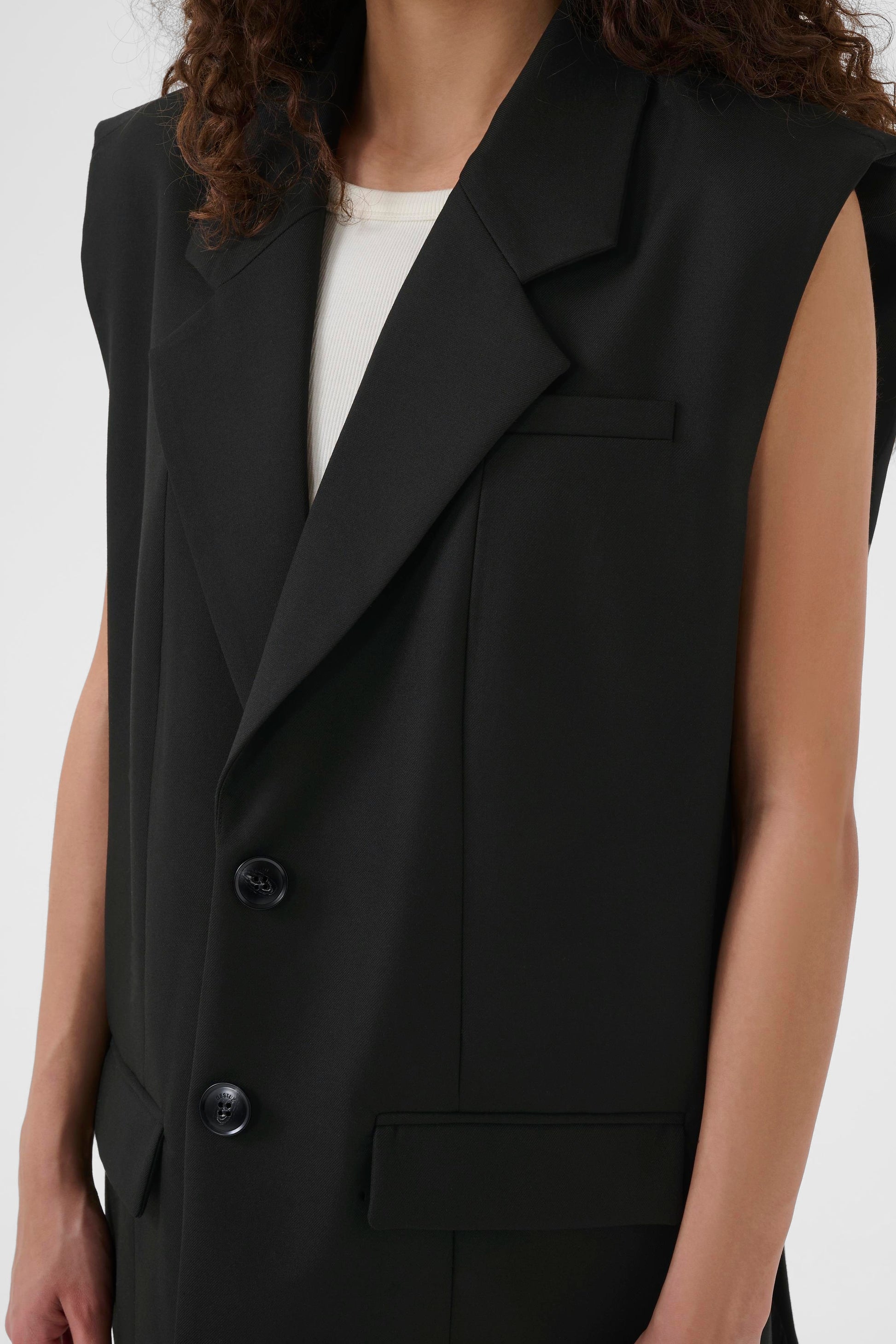 Die GZpaula Long Vest ist ein Statement zwischen klassischem Tailoring und moderner Coolness. Mit ihrem oversized Fit und der Länge bis zur Mitte des Oberschenkels schafft sie Raum, Bewegung und Präsenz – ein Styling-Piece, das sowohl über Shirts, Feinstrick oder solo getragen wirkt. Der ärmellose Schnitt bringt klare Linien, der tiefe Fall sorgt für lässige Eleganz.